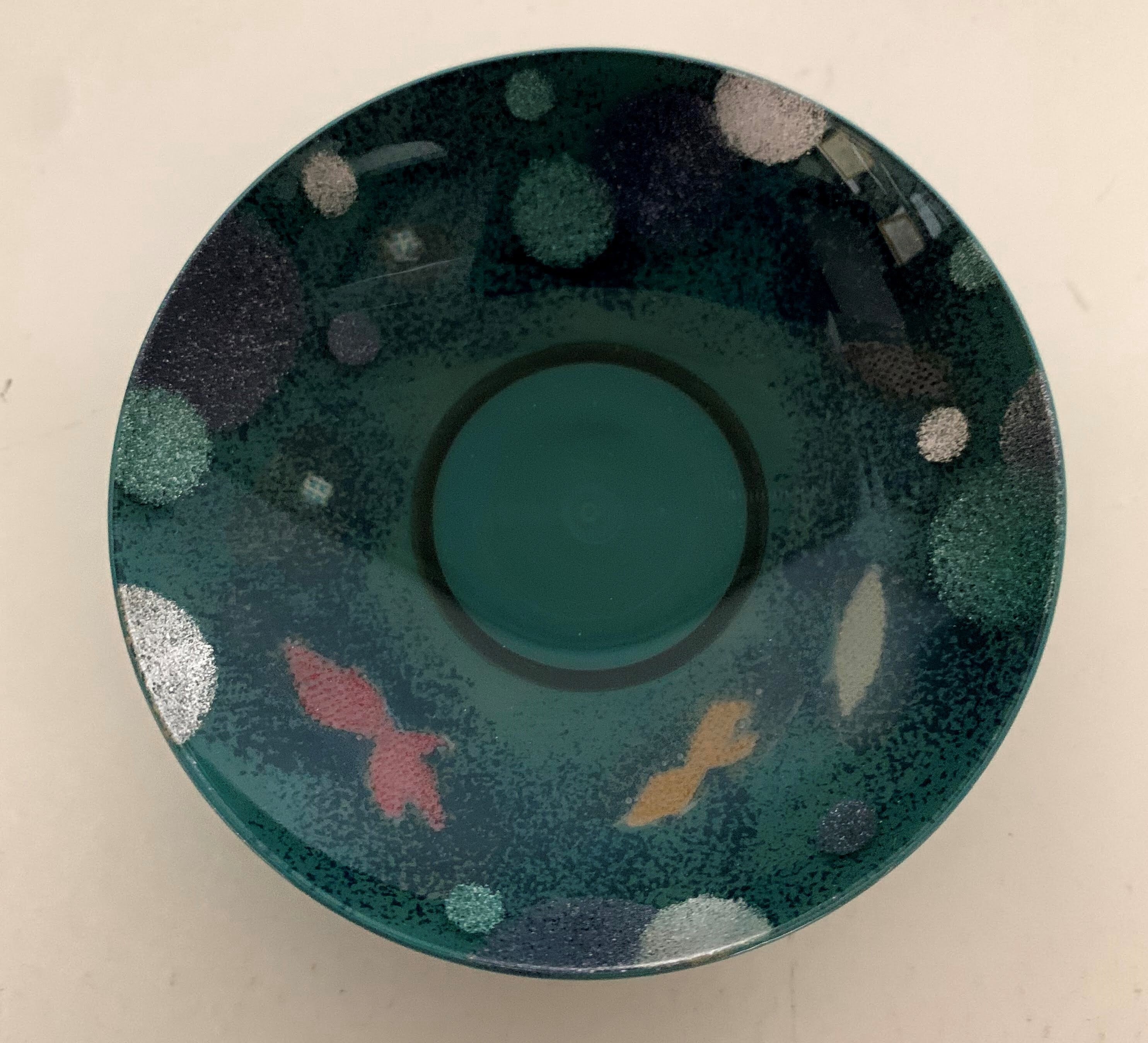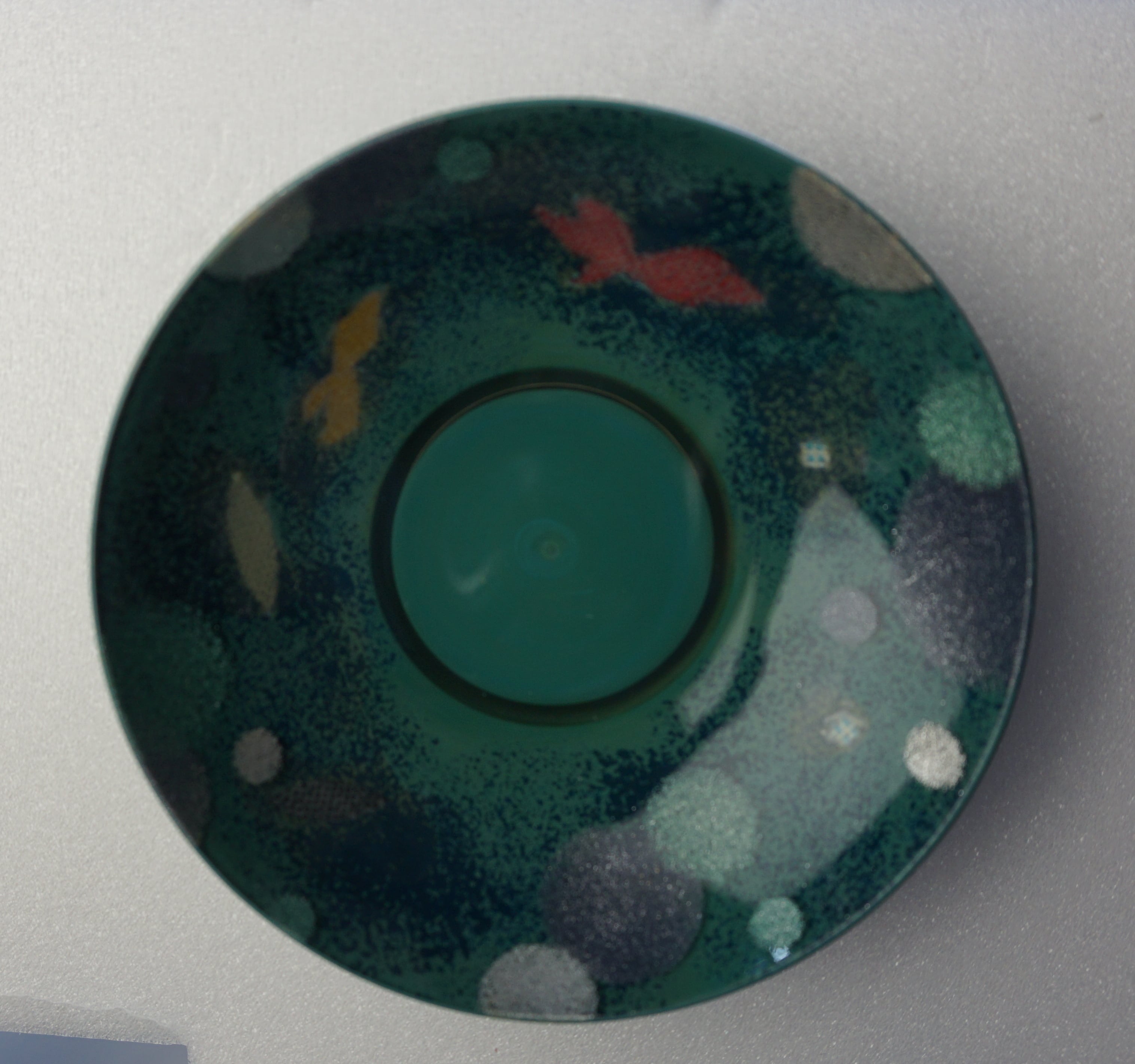 植物由来の透明な紫翠盃に、捨てられてしまう端切れをゼラチンで張り付ける技法を試行錯誤して作成。